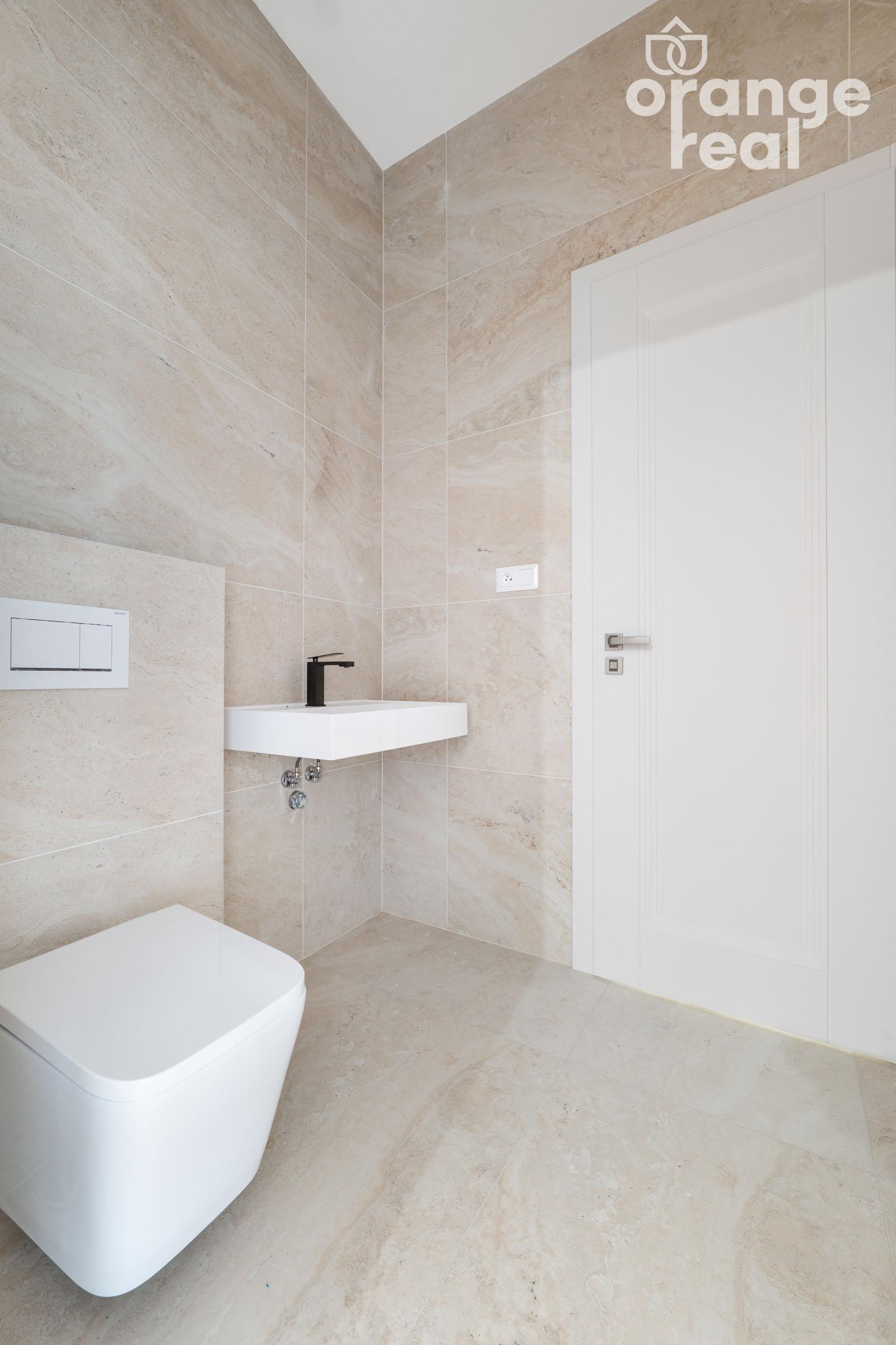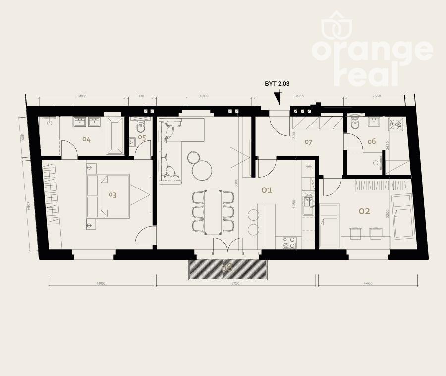 Ponúkaný byt sa nachádza na druhom nadzemnom podlaží. Dispozične pozostáva zo vstupnej chodby, kuchyne spojenej s obývacou izbou s výstupom na priestranný balkón, 2 spální, komory, kúpeľne so sprchovacím kútom a s WC, samostatného WC a kúpeľne s vaňou, dvojumývadlom a sprchovacím kútom. Kúpeľne sú úplne dokončené. Orientácia celého bytu je na juhozápad.