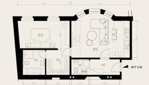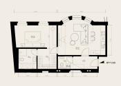 Ponúkaný byt sa nachádza na druhom nadzemnom podlaží. Dispozične pozostáva zo vstupnej chodby, kuchyne spojenej s obývacou izbou, 1 spálne, walk-in šatníka, kúpeľne so sprchovacím kútom, WC a vaňou a samostatného WC. Kúpeľne sú úplne dokončené. Zaujímavosťou tohto bytu sú okná v obývacej časti do polkruhu. Orientácia celého bytu je na severovýchod do tichého dvora s výhľadom na Dóm sv. Alžbety.