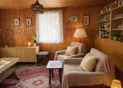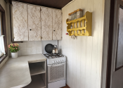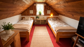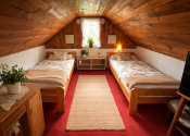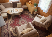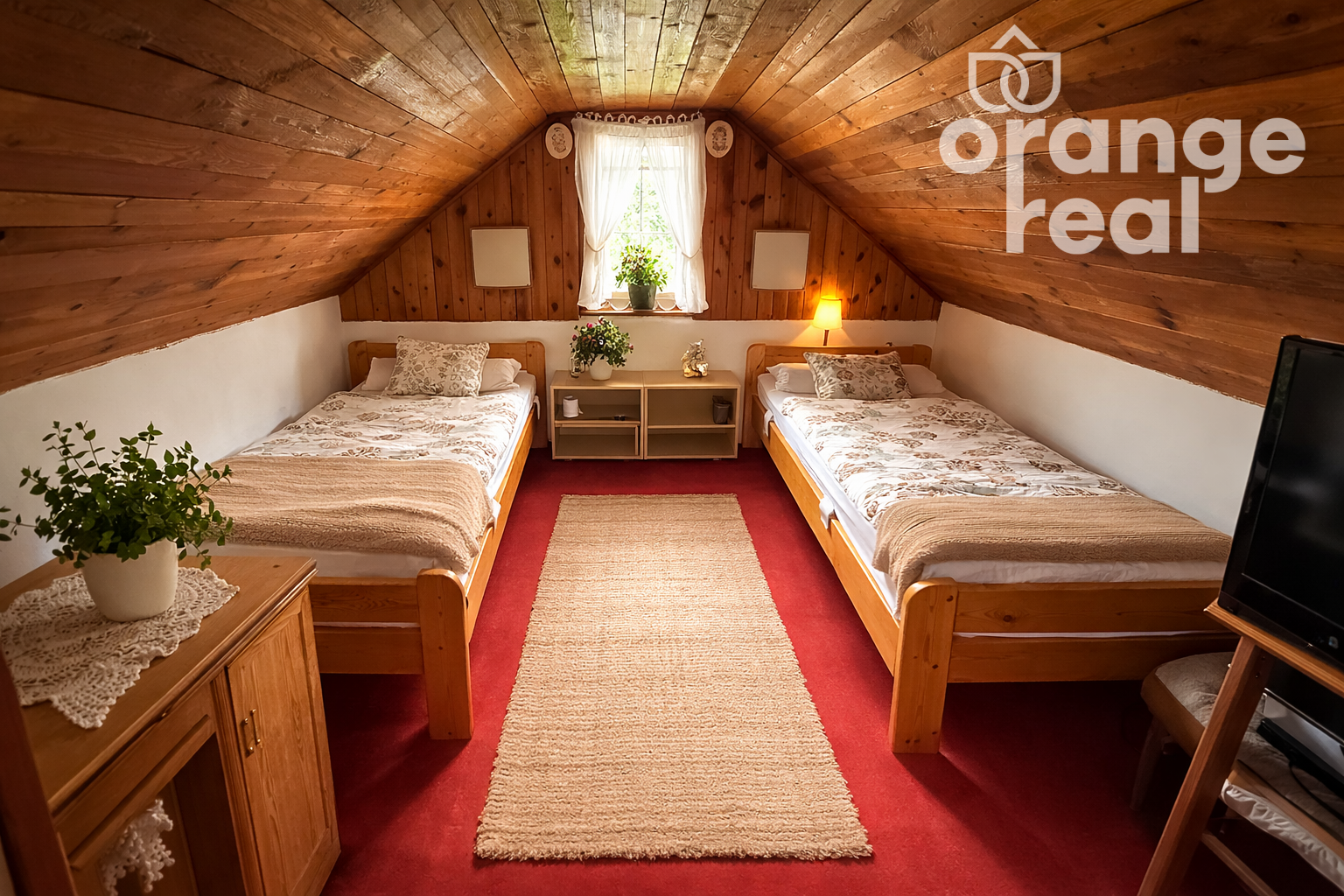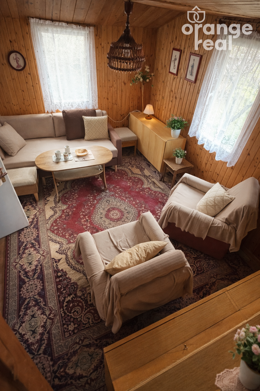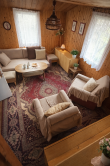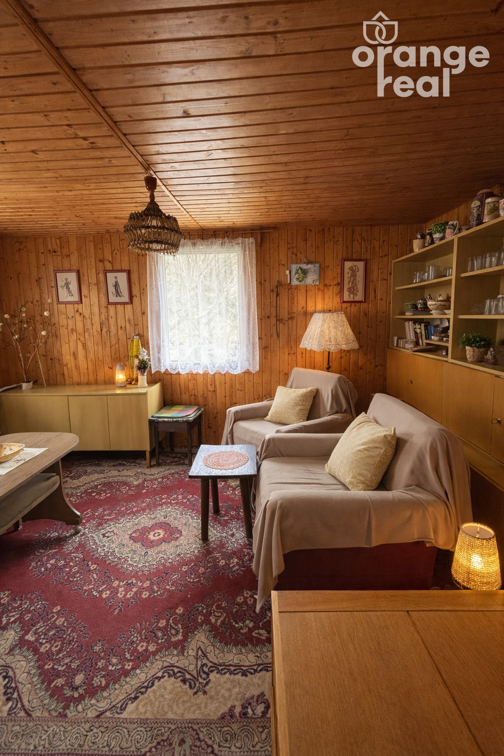 Chatka disponuje, zastrešenou verandou, vo vstupnej časti chaty je napravo kuchyňa a naľavo kúpeľňa s toaletou, nasleduje obývačka s pieckou na tuhé palivo, ktorá dokáže vykúriť celú stavbu, za ňou ešte jedna izba. z oboch izieb je výstup do podkrovia. Zo zadnej izby vieme využiť podkrovie. Je nízke, možnosť spania pre deti, alebo využiť ako úložný priestor. Z prvej obývačky je výstup do podkrovia, kde sa nachádza plnohodnotná spálňa. s dvomi posteľami.